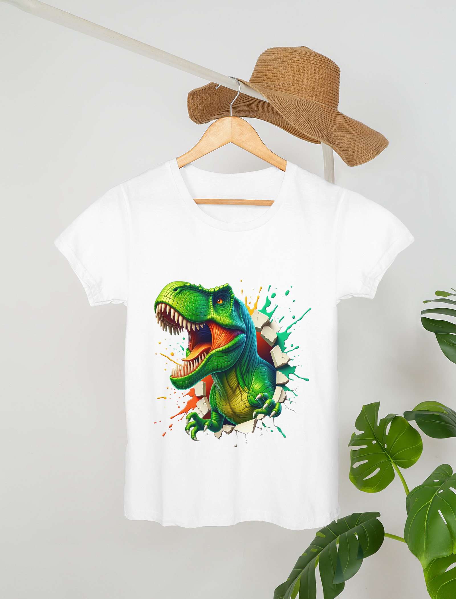 Unleash your inner beast with this bold, action-packed T-shirt design featuring a ferocious T-Rex bursting through a wall in a splash of vibrant colors. The dynamic mix of neon greens, fiery oranges, and splash effects brings this prehistoric predator to life — making it the perfect tee for kids and adults who love energy, adventure, and attitude.