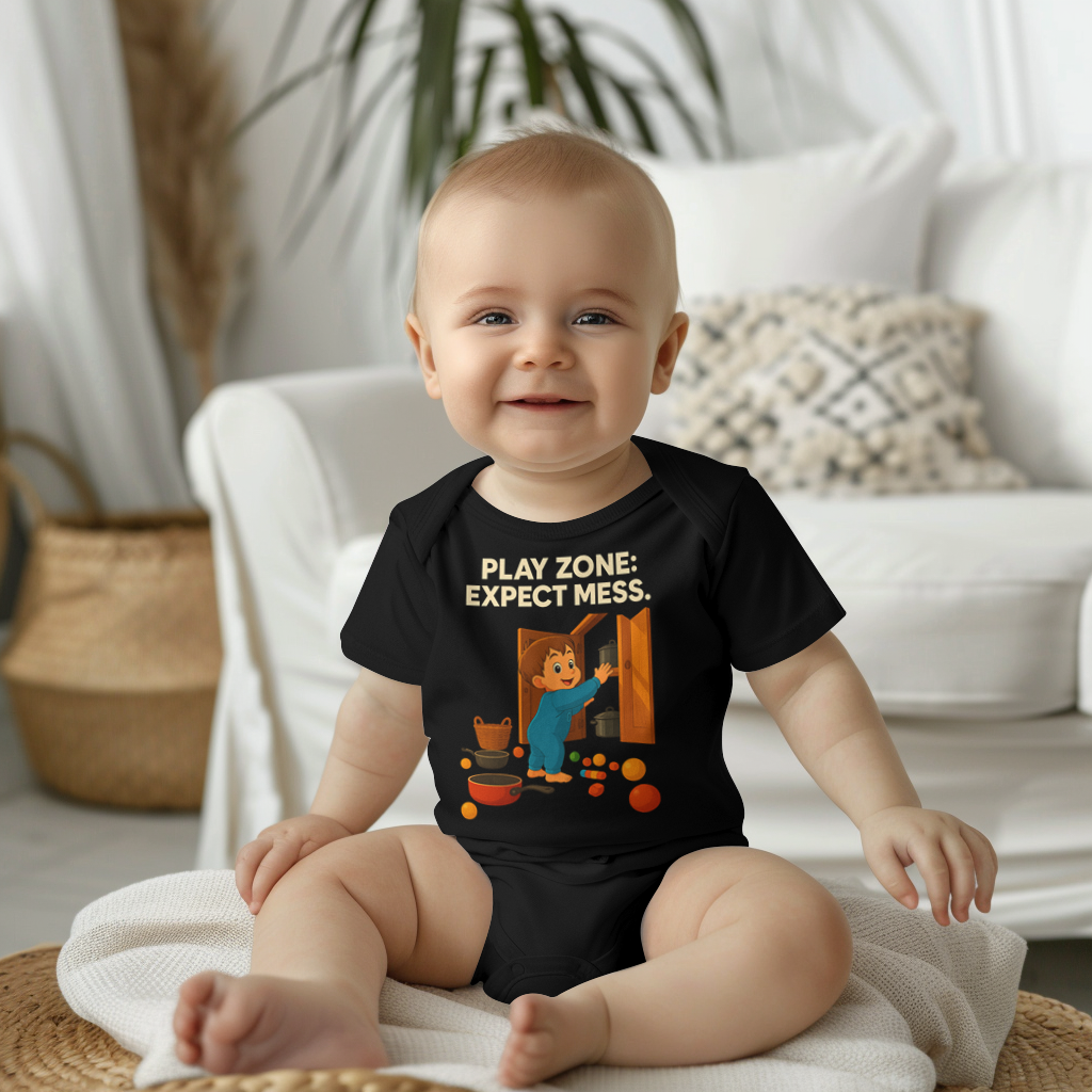 This playful and heartwarming design captures the joyful chaos of childhood curiosity. Featuring a cheerful toddler exploring kitchen cabinets with toys and pans scattered around, it perfectly illustrates the innocence and energy of little adventurers. The glowing text “PLAY ZONE: EXPECT MESS.” adds a touch of humor and realism every parent can relate to.