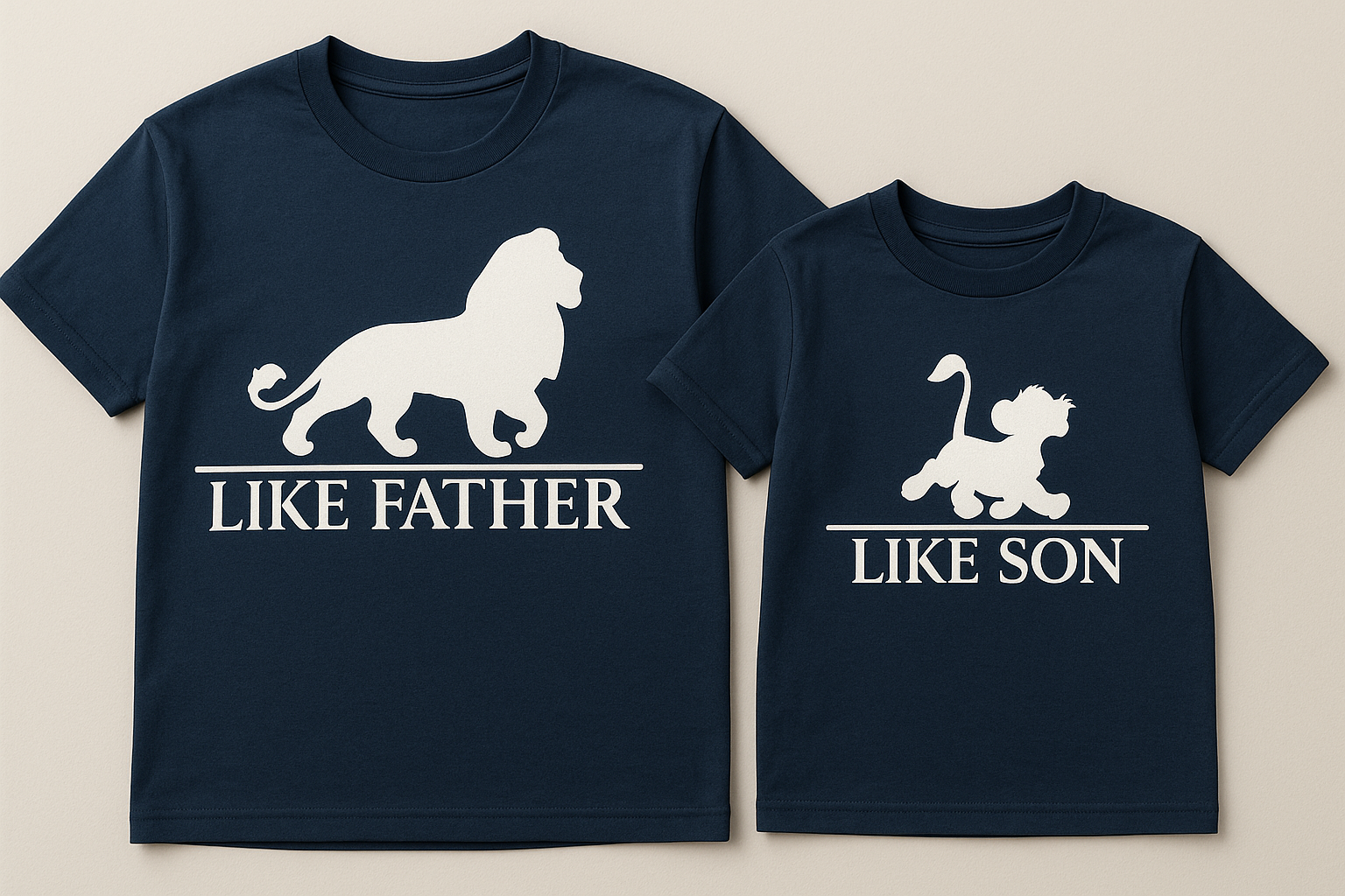 The son’s tee carries the playful lion cub — curious, joyful, and full of spirit.