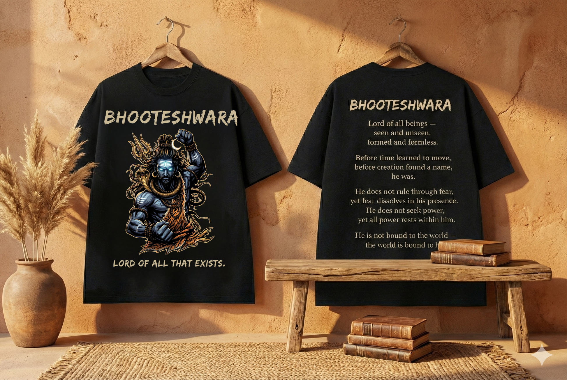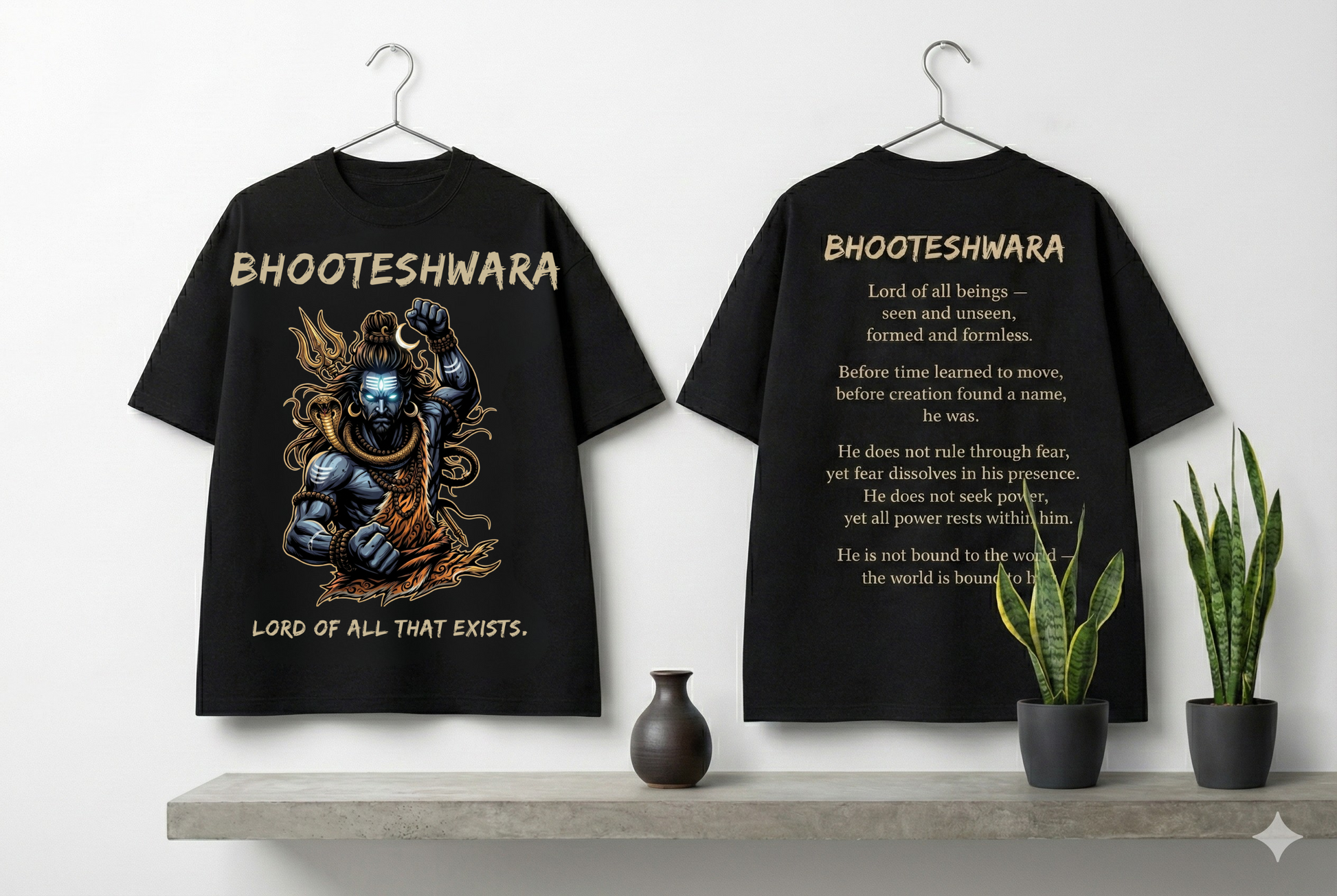 The front artwork embodies raw dominance: restrained power, unshaken stillness, and control without aggression. The back verse reflects the deeper truth — Shiva does not rule through fear; fear dissolves in his presence. He seeks no power, yet all power rests within him.